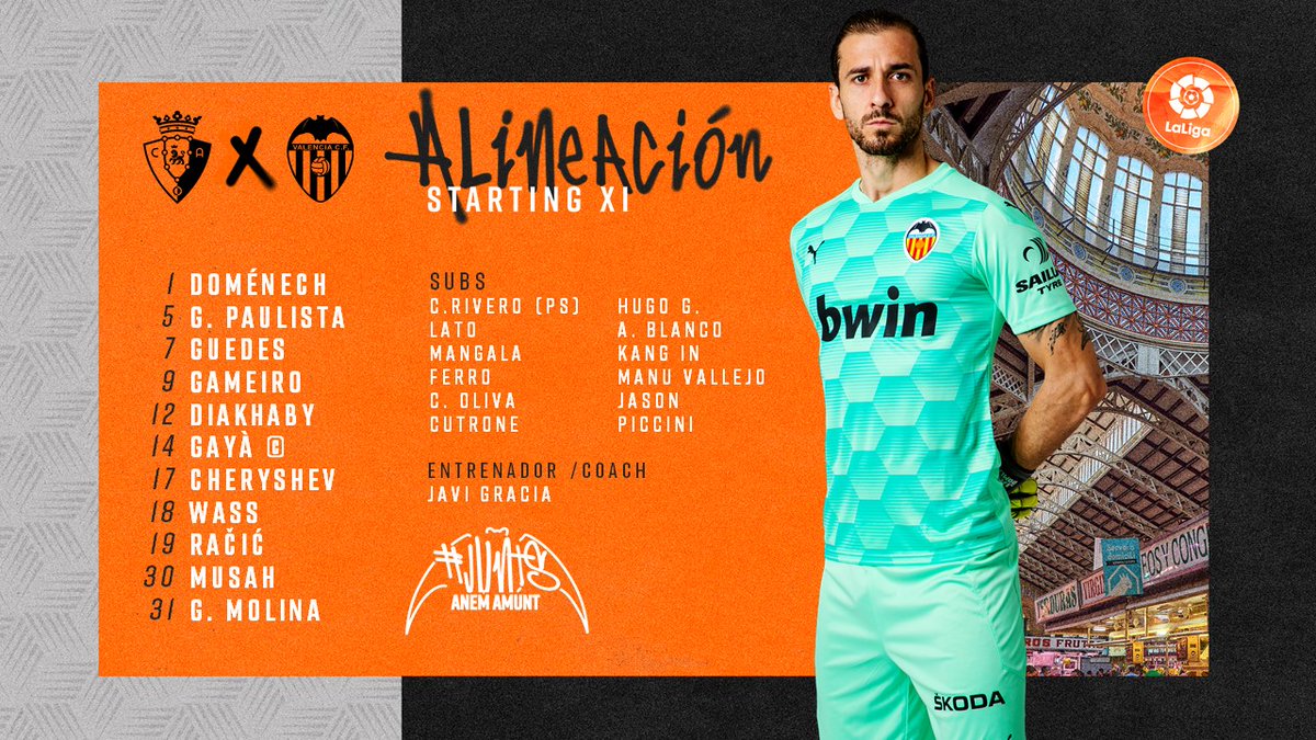 Valencia: Jaume; Molina, Diakhaby, Gabriel Paulista, Gayà; Musah, Wass, Racić, Cheryshev; Guedes, Gameiro.